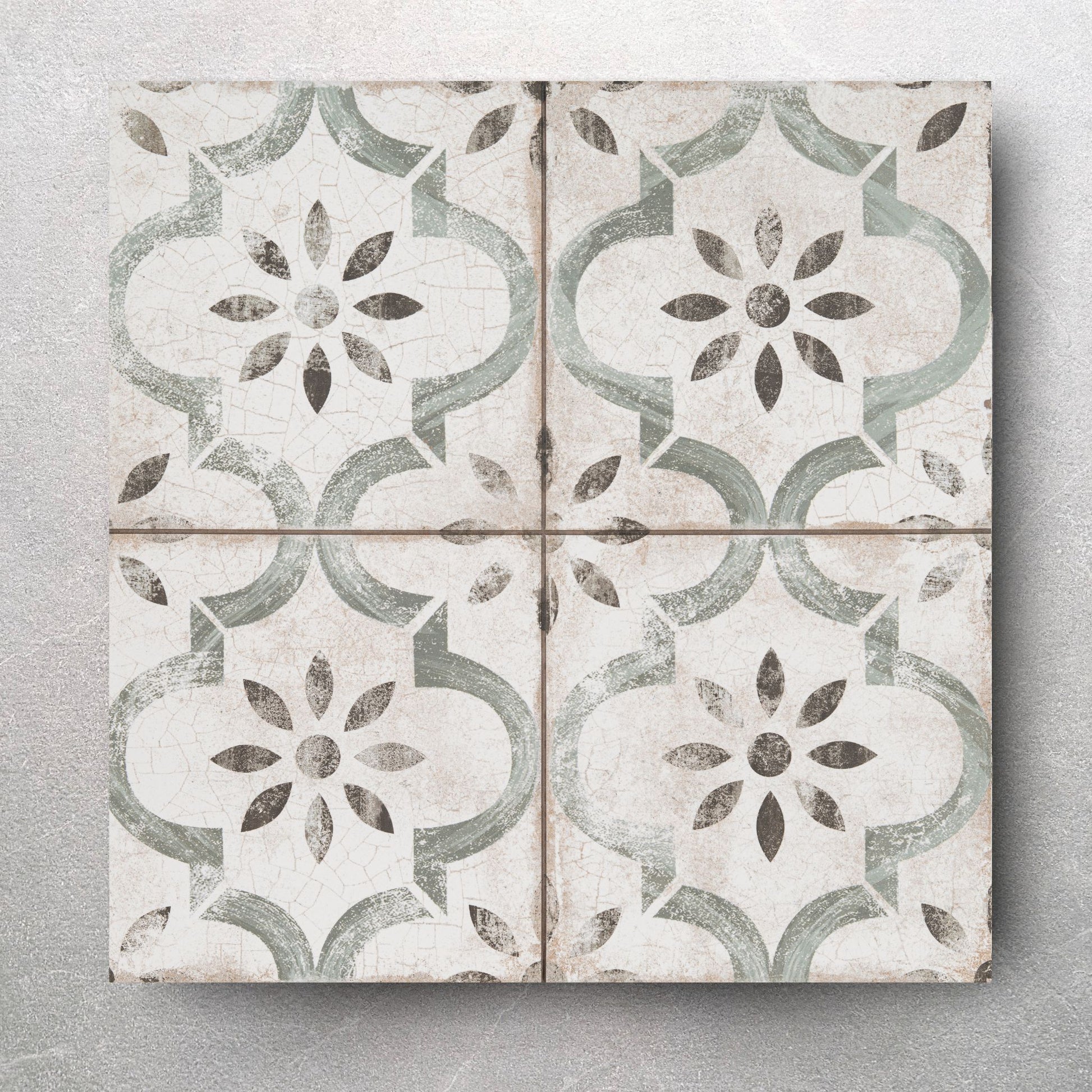 The York Sage Green 450mm x 450mm patterned porcelain victorian floor tiles can be used in internal areas making them an excellent option for a flexible living space. Exquisitely decorated to produce a delightfully vintage appearance these frost resistant floor tiles have a stunning aged off-white background with a faded blue repeating arabesque design. Each of these designs has a delightful stylised charcoal petal design in its centre; the whole effect is extremely appealing.